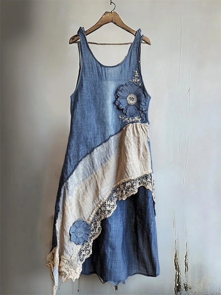 Flowers Denim Textile Lace Patchwork Tank Dress