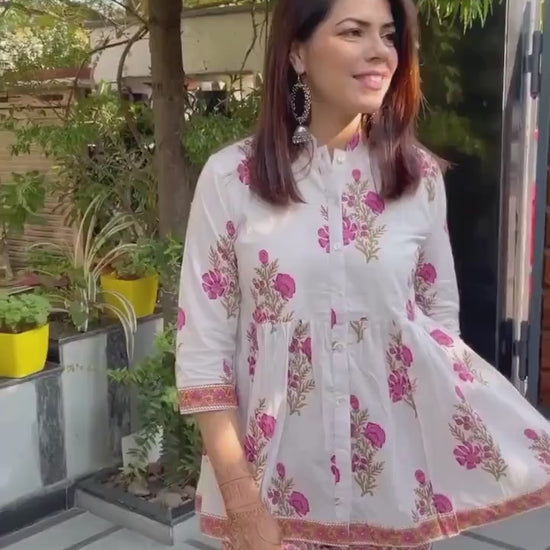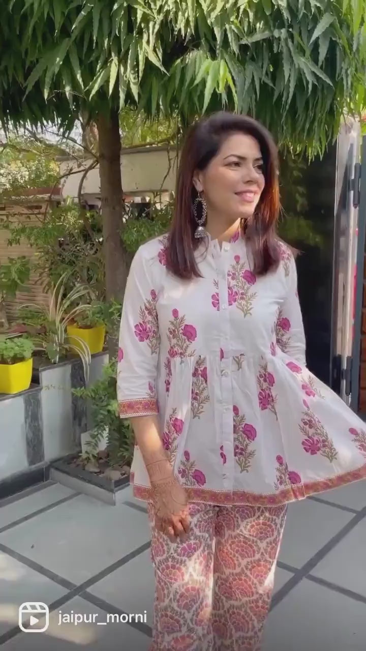 Handblock print White printed Kurti with ethnic motifs,mandarin collar and 3/4 th sleeves comes with pure block print cottontrousers with elasticated waistband and slip in closure.This beautiful short kurti with pants is the perfect daywear/loungewear .
