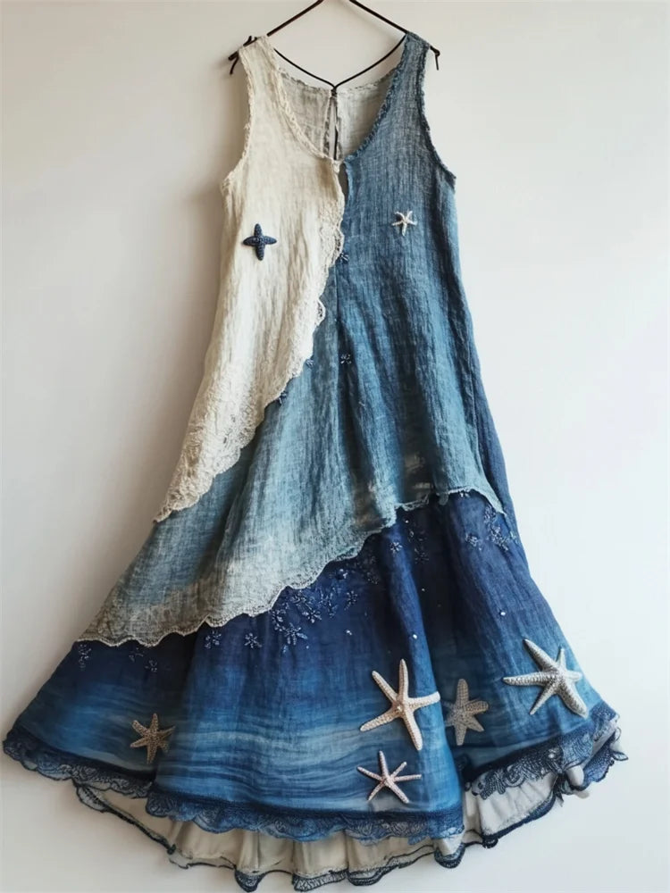 Starfish Embroidered Sea Waves Gradient Lace Flowy Linen Dress