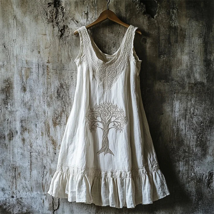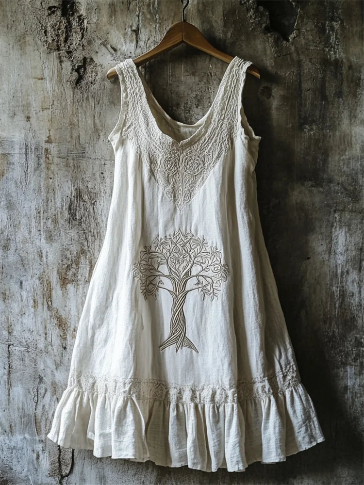 Tree Of Life Lace Patchwork Ruffle Hem Linen Dress