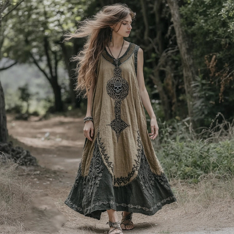 Vintage Tribal Viking Celtic Knot Linen Blend Tank Midi Dress